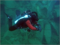 Der Abschlusstauchgang fand in Kessel Nr. 1 statt. Dort hatten wir gleich zum 1. TG schon den großen Barsch gesichtet, jedoch den Hecht vermisst. Etwas unentschlossen mit 100 bar in der D-12 machten wir uns doch auf den Weg einer zweiten Kesselumrundung und wurden mit diesen Hechtbildern belohnt. Er hatte sich auf einen Steilwandvorsprung in der rechten hinteren Ecke des Kessels zurückgezogen.