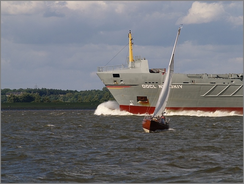 An diesem Wochenende war das Wetter recht abwechslungsreich. Schönwetterwolken und viel Wind – ideal zum Segeln auf der Elbe zwischen den riesigen Schiffen.